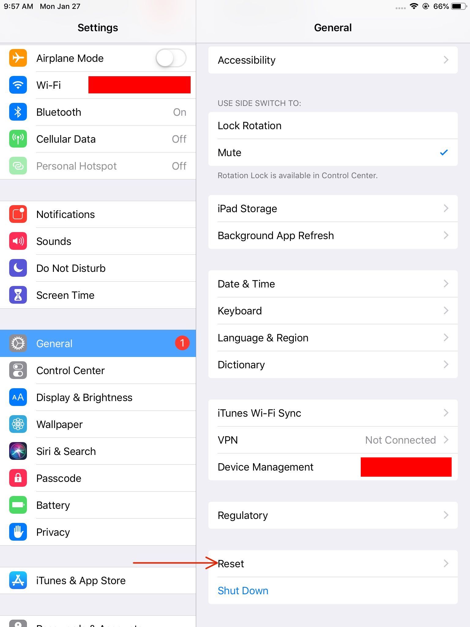 In General, on the right side, please scroll down to the end until you see "Reset" and select it.
